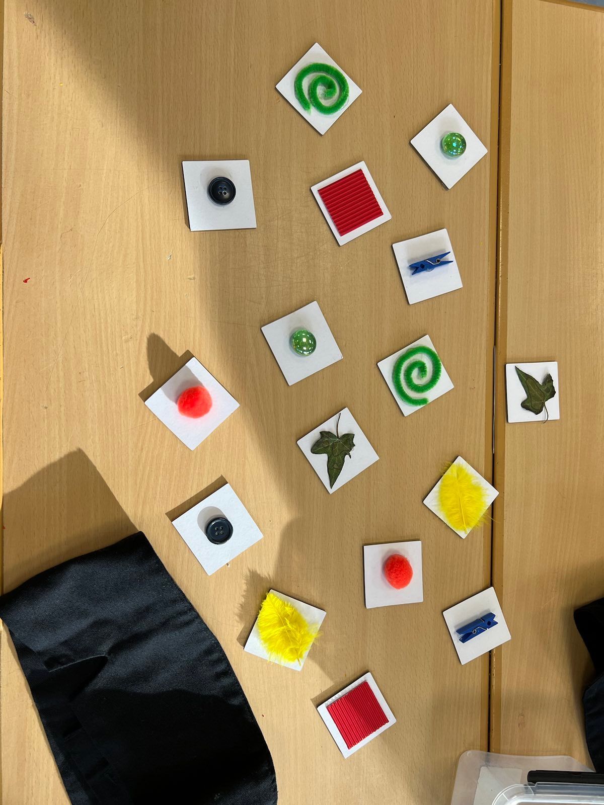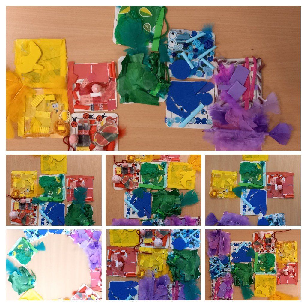 Sie haben verschiedene Materialien in Farbfamilien aufgeteilt und auf Bierdeckel geklebt. Mit den farbigen Bierdeckeln konnten immer wieder unterschiedlich wirkende Bilder gelegt werden.