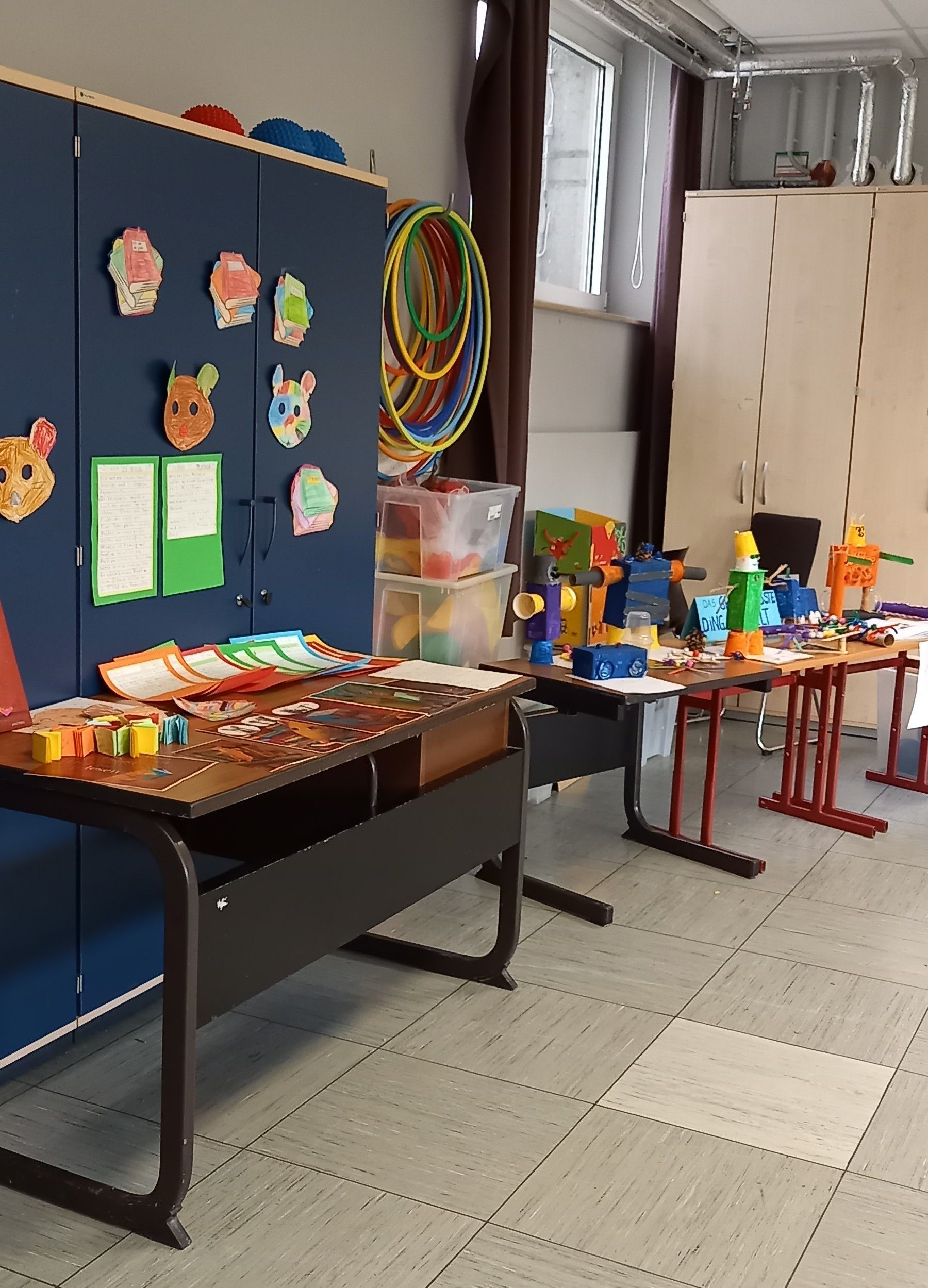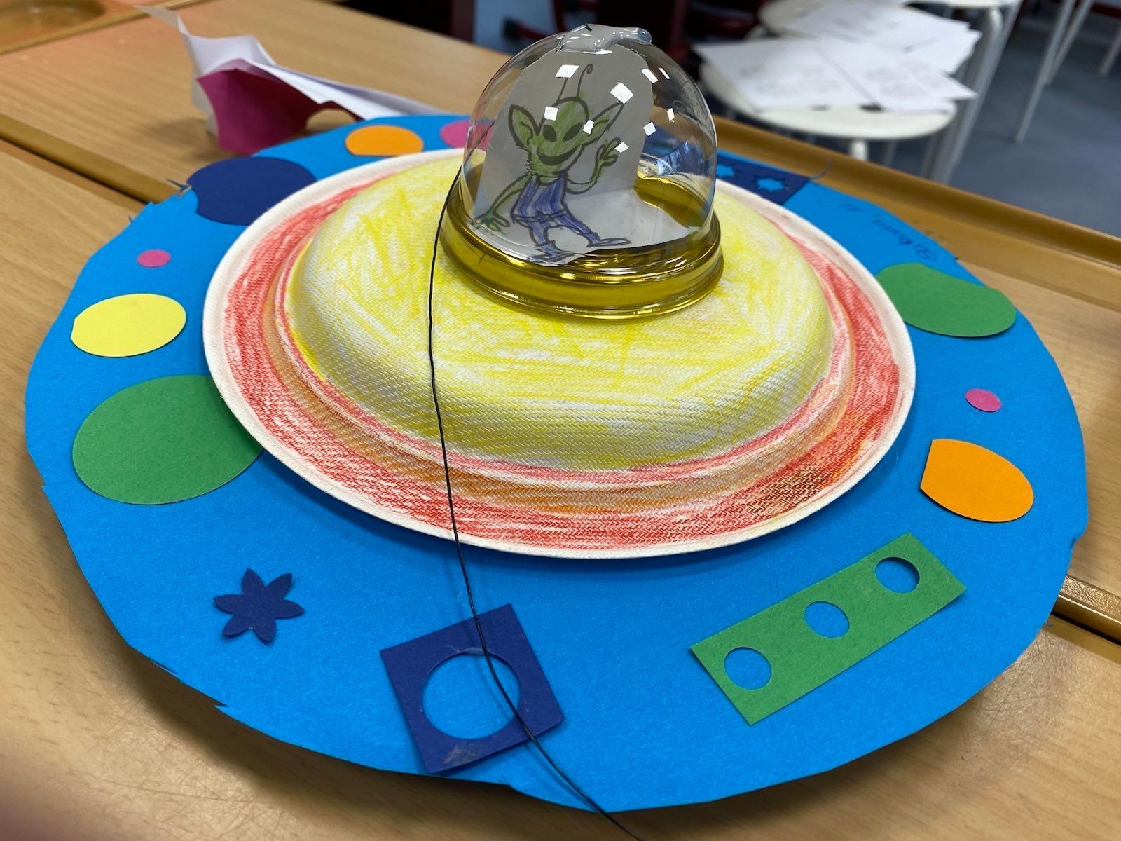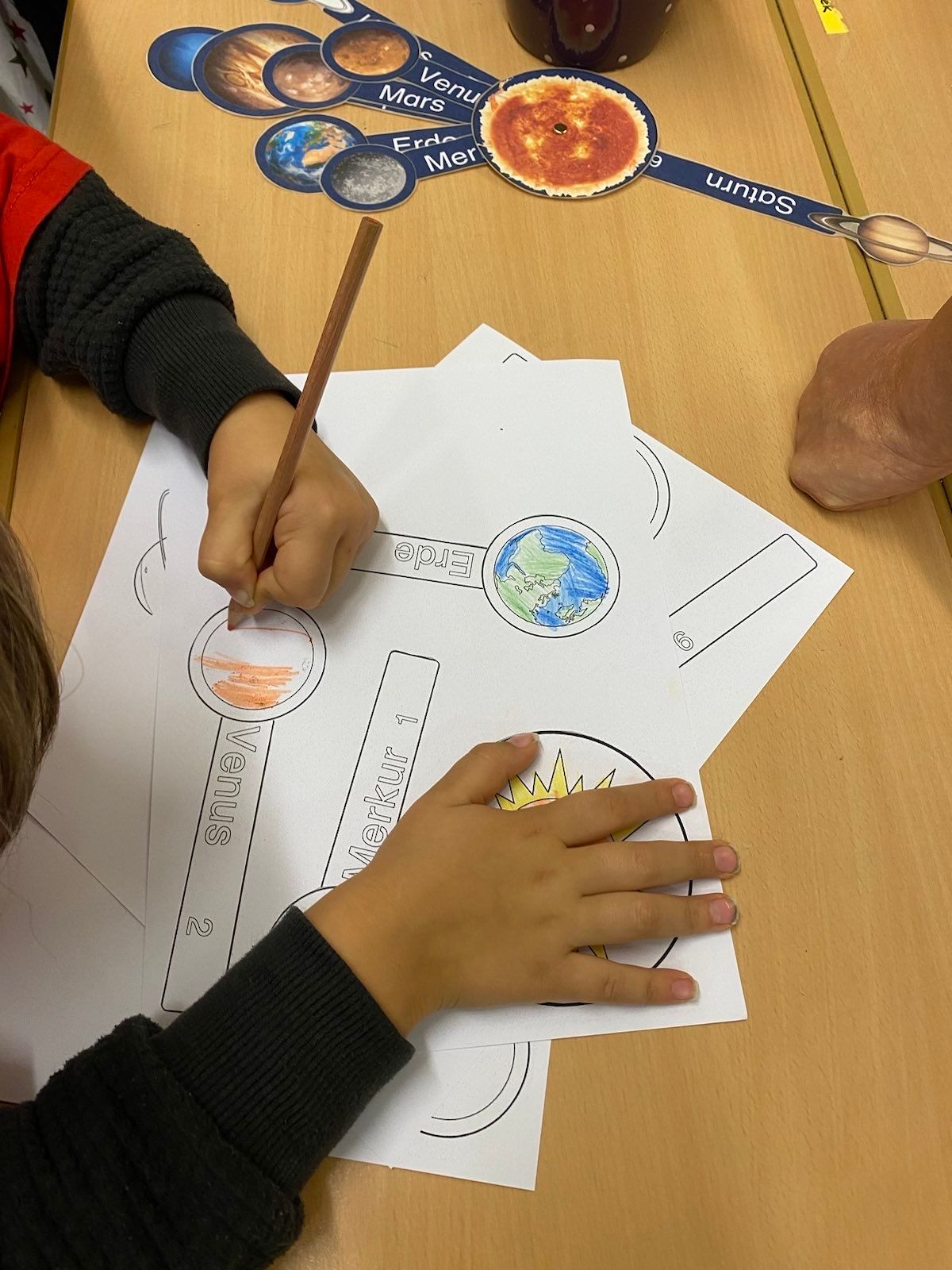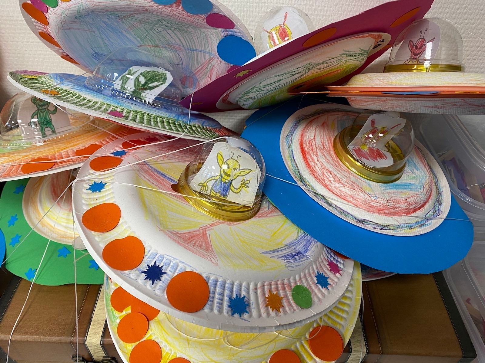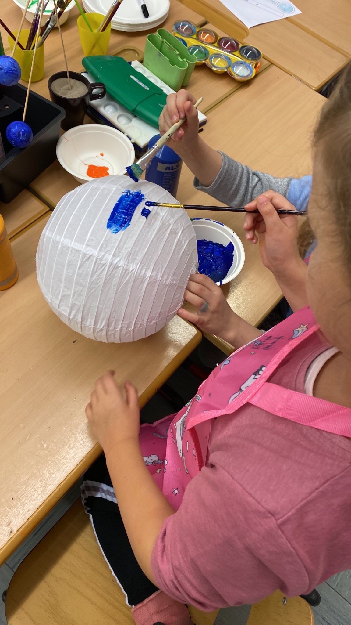 Im November fand unsere Projektwoche zum Thema Weltall statt. Die Kinder durchliefen verschiedene Stationen, an denen sie viel über das Universum lernten und sich kreativ austoben konnten. So bastelte jede Klasse ein eigenes Planetensystem und Aliens in Ufos. Mit Pastellkreide entstanden wunderschöne Planetenbilder und in der Sporthalle konnten sich die Kinder in einem Weltraum-Parcours so richtig austoben. Zum Ausruhen konnten sich die Schülerinnen und Schüler in die Weltraumbibliothek begeben oder im Weltraumkino mit einer großen Portion Popcorn zusehen, wie ein Astronaut auf der ISS eigentlich lebt.