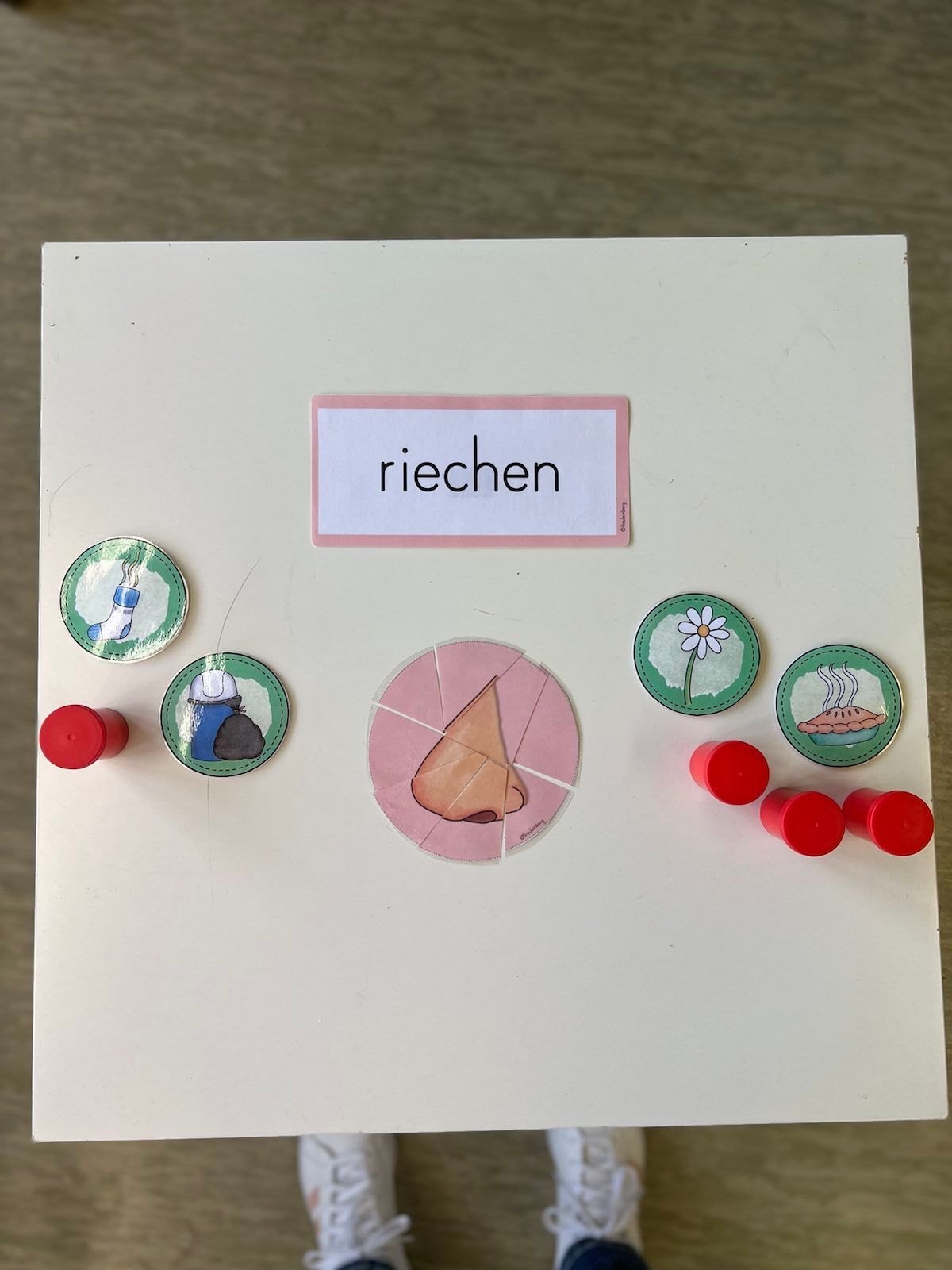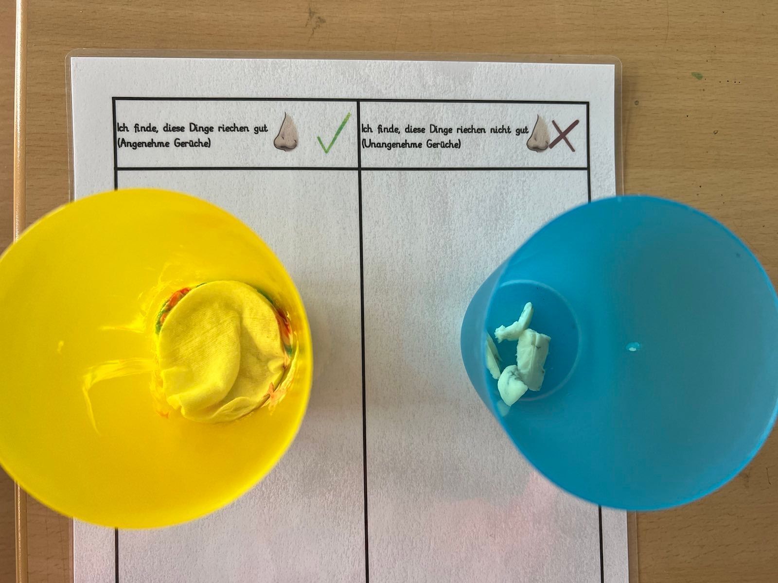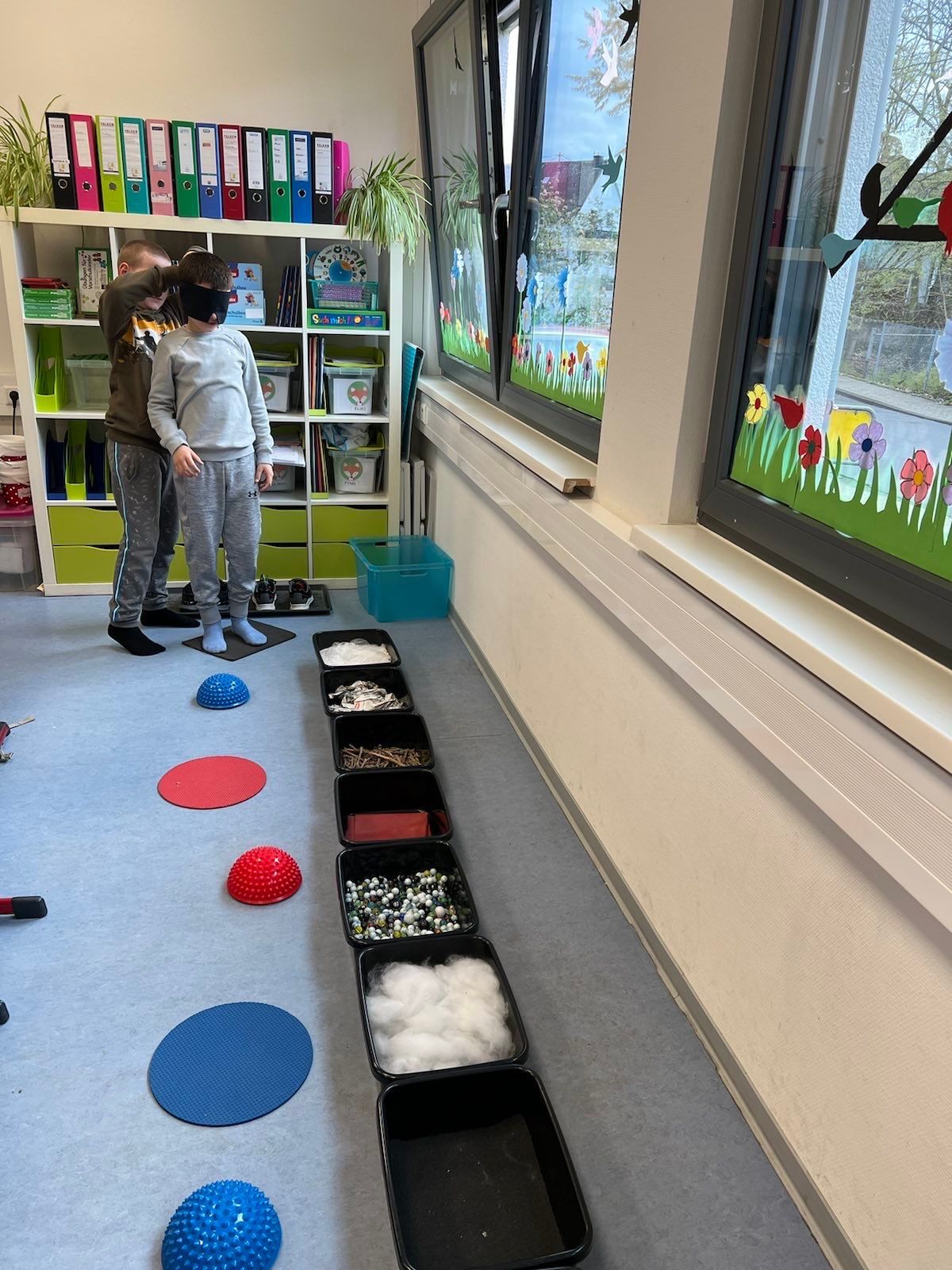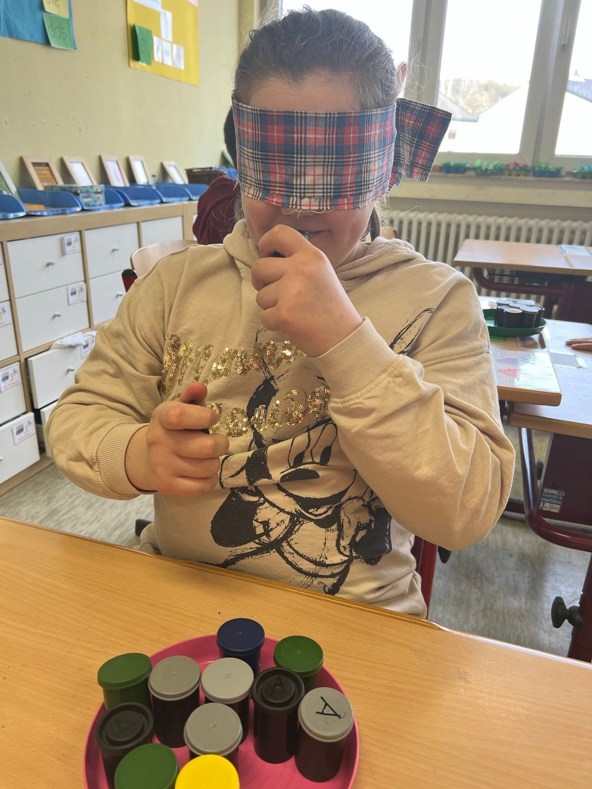 Im Klassenverband konnten die Schülerinnen und Schüler Stationen zu den verschiedenen Sinnen durchlaufen und diese auf diverse Arten erkunden und ausprobieren. Neben einem Tastparcours, Geschmackstests und Riechrätseln, konnten die Ohren im Krachraum herausgefordert oder die Füße ordentlich durchmassiert werden.